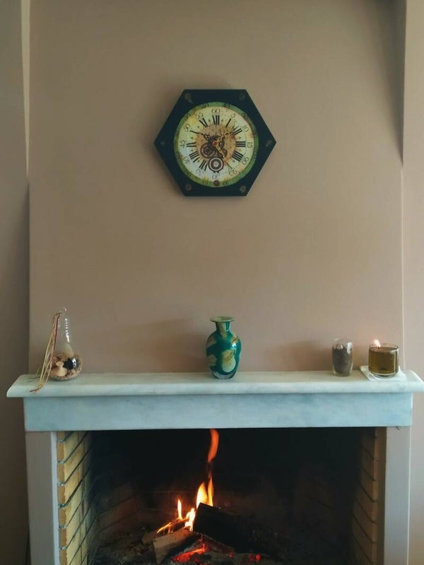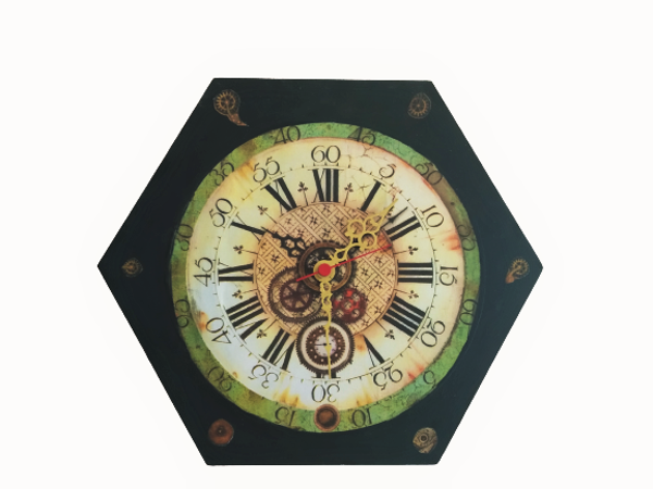 Χειροποίητο ξύλινο ρολόι τοίχου με τεχνική ντεκουπάζ.
