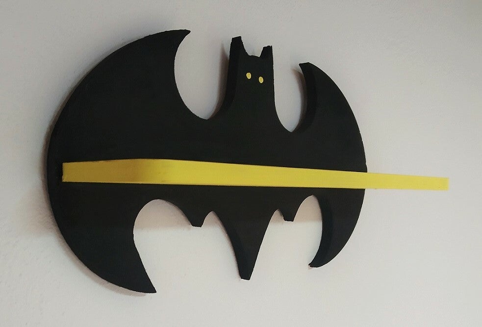 Ξύλινο χειροποίητο ράφι με παιδικό ήρωα Batman σε μαύρο-κίτρινο χρώμα για να διακοσμήσει κάθε τοίχο του παιδικού σας δωματίου με μοναδικό και πρωτότυπο τρόπο.